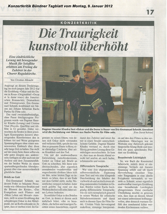 ...Herausragend war sodann auch das Konzert für Flöte und Streicher in E-Moll von S. Mercante. Solistin Cristina Vital aus Chur verfügt nicht nur über ein grosses Können auf ihrem Instrument, sie versteht es auch, sehr stark auf das Orchester einzugehen. Ihre Musikalität und Virtuosität kam besonders im Rondo Russo und Allegro vivace bestens zum Ausdruck...